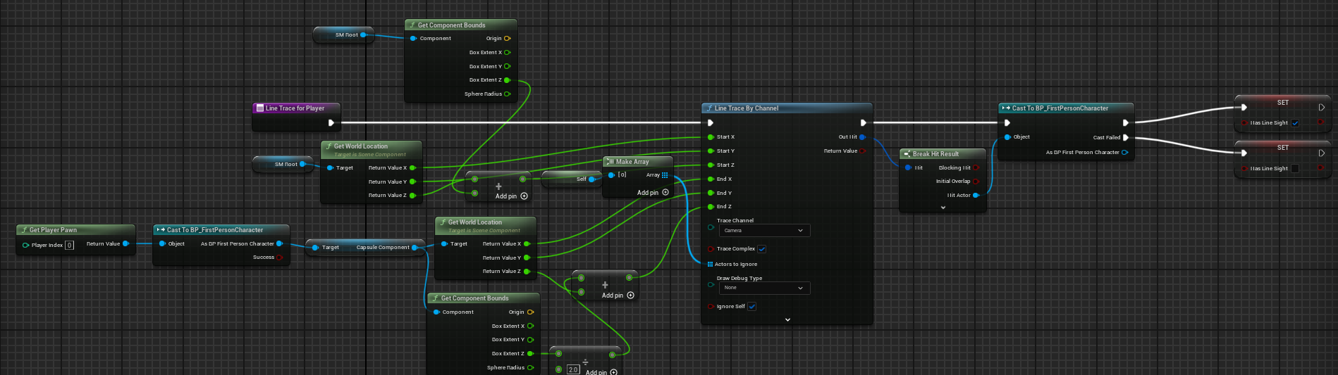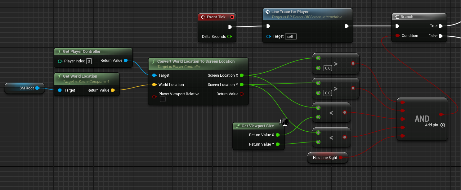 Above you can see the logic applied to teleporting objects, this logic lets the object know when it is both in the players viewport and when it has direct line of site to the player. With just the left logic the cube would not move when obfuscated by an object as it would still be within the bounds of the viewport. The logic on the right seemed like the simplest way of doing it. It could be improved by increasing the number of checks bounds. A check could be done from each corner to get more consistency with teleportation from obfuscation.
