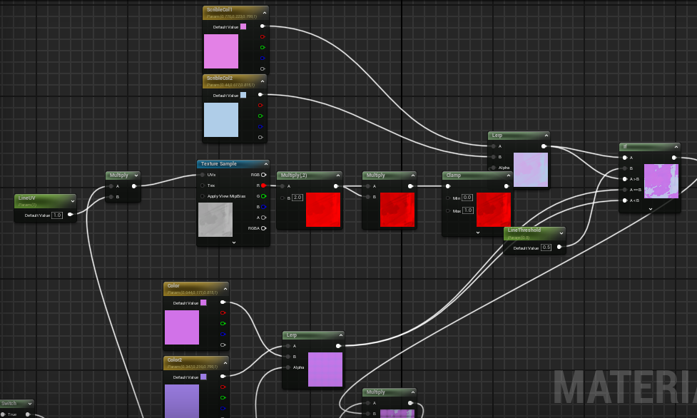 Color variation macro variation based on designer specified parameters. The higher the "LineThreshold", the more of the splatter texture would be used.